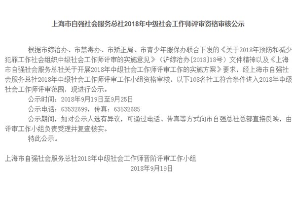 2018年7月19日,市综治办下发中级社工师的评审工作实施意见的征求意见函,市禁毒办和自强总社就其中几个数据截止的时间节点予以了明确,强调了外地(非全国、非上海)考出的社工师证书和心理咨询师证书,不符合参评资质。