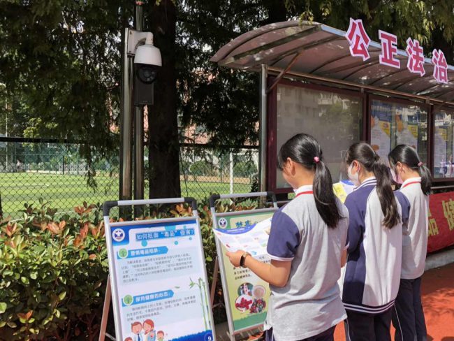 2022年9月20日,自强杨浦工作站四平社工点禁毒社工与禁毒民警一起到上海市铁岭中学开展以“无毒青春•阳光一生”为主题的禁毒宣传活动。