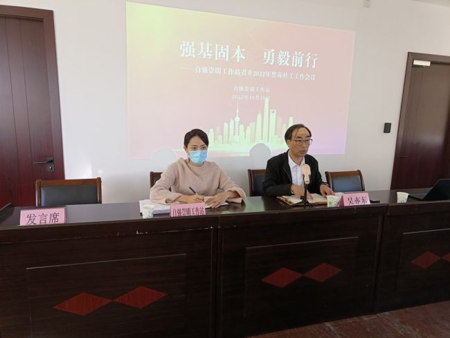 为进一步加强禁毒社工队伍管理,强化社工履职履责意识,深入推进二十大、进博会禁毒安保工作。10月20日,自强崇明工作站组织全体禁毒社工在社区帮教服务中心召开“强基固本 勇毅前行”为主题的工作例会和业务培训。特邀请区政法委禁毒协调室主任吴亦东参加。