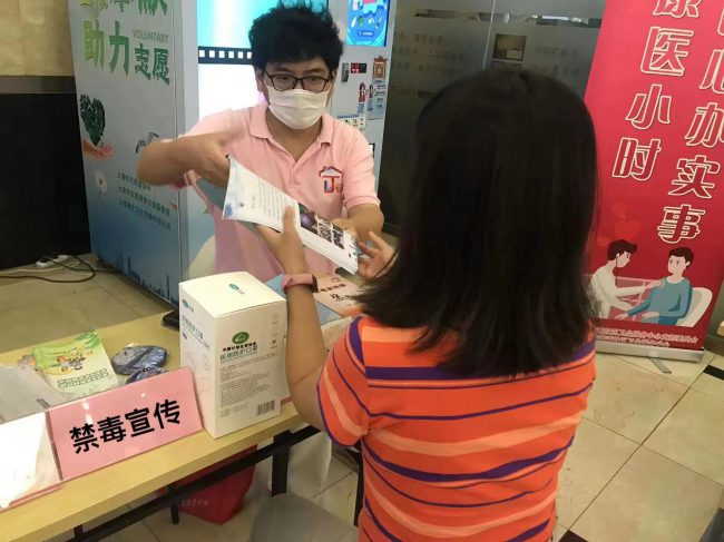 2023年9月26日中午,为了迎接十一长假,响应亚运安保要求,长宁区新华路街道禁毒社工、禁毒志愿者汇合法宣、计生、卫生等相关部门人员以“组团式服务”的形式来到万宝国际商务中心向白领人群提供禁毒宣传志愿服务。