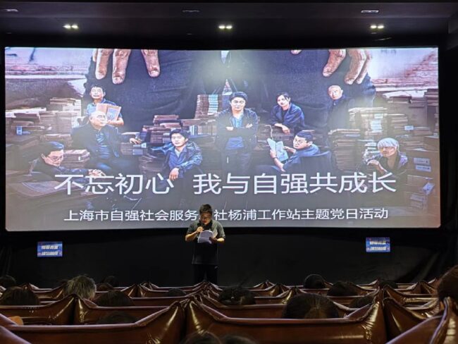 2024年7月12日下午,为庆祝中国共产党成立103周年,深入推进党纪学习教育,自强杨浦工作站组织全体社工开展了“不忘初心,我与自强共成长”主题党日观影活动。本次活动邀请了区委政法委禁毒室主任杨慈晖、各街道禁毒专职干部、禁毒志愿者代表一同参加,共有90余人参加了本次活动。