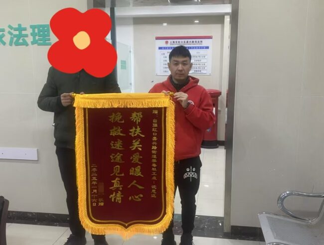 1月17日,戒毒成功对象老西(化名)将一面印着“帮扶关爱暖人心,挽救迷途见真情”的锦旗送到了自强虹口嘉兴路社工点……