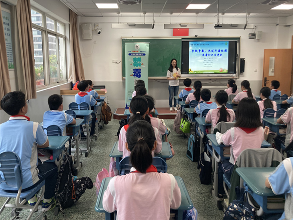详情9月12日下午,自强虹口曲阳路社工点禁毒社工会同禁毒志愿者联合虹口检察院、高境强制隔离戒毒所民警一同来到民办宏星小学,开展了一场主题为“我的青春我做主 珍爱生命不沾毒”的校园青少年毒品预防教育宣传活动。