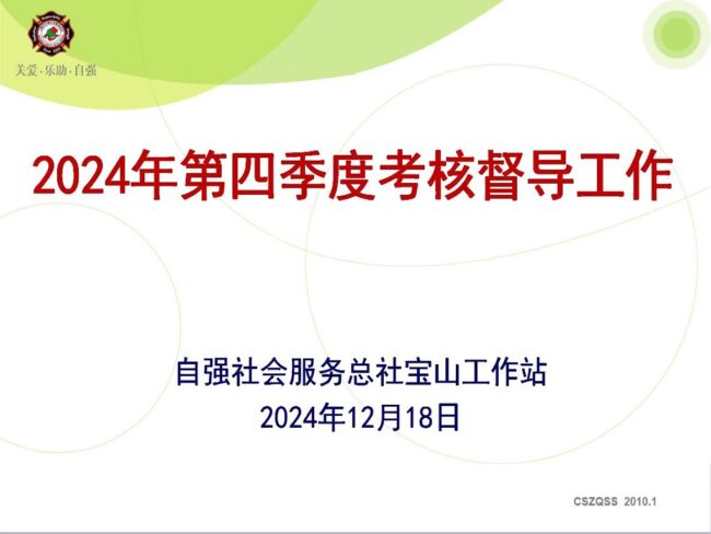 【宝山】自强宝山工作站开展第四季度考核工作(宝山顾村 张丽燕)各区动态, 宝山区宝 山2025年2月11日为全面掌握宝山区一线社工各项工作的开展情况,提升禁毒社工的业务工作能力和水平,2024年12月18日起,自强宝…