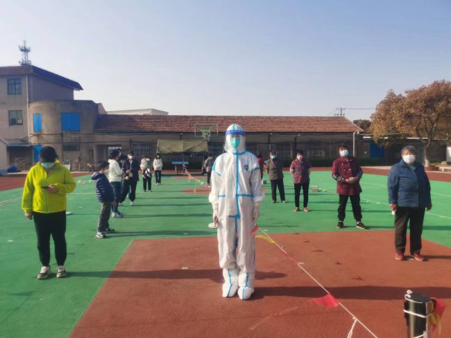 “各位居民朋友,请带好口罩,提前准备好核酸检测码,有序排队,谢谢配合……”在前进居委会的广场前,循环能听到同伴辅导员老刘的温馨提示。