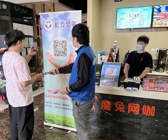 9月28日虹口区曲阳路街道的禁毒社工会同禁毒志愿者们在街道平安办的组织协调下,分别来到名为“魔兔网咖”和“虎鲨电竞”的两家网吧,组织开展了禁毒教育宣传活动。