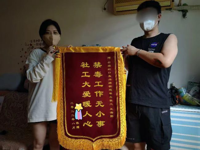 王社工收到了服务对象阿伟的这份真挚的感谢之情——一面印有“禁毒工作无小事,社工大爱暖人心”的锦旗,他感谢禁毒社工为他全心全意的付出。