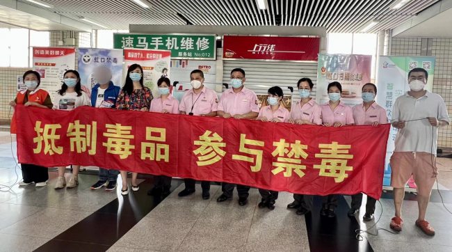 7月下旬,在虹口区曲阳路街道平安办的组织协调下,曲阳路社工点的禁毒社工会同禁毒志愿者来到地铁轨交三号线赤峰路站,开展了一场主题为“抵制毒品,参与禁毒”的禁毒宣传活动。