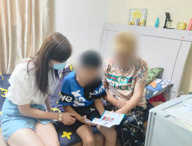 2022年8月10日上午,自强虹口曲阳路街道禁毒社工会同禁毒志愿者一同走访了服务对象张某的家里,在探望身患重病的服务对象的同时,还对其家庭进行了一场主题为“亲子共禁毒,不让毒品进家门”的禁毒宣传活动。