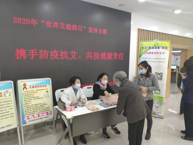 11月30日,打浦桥街道禁毒社工组联合街道社区卫生服务中心,在装修一新的社区医院大堂里设立禁毒宣传摊位,通过摆放宣传展板、毒品仿真样品、发放禁毒宣传手册及宣传品、引导添加“黄浦禁毒”微信公众号等形式向市民群众介绍毒品的种类、危害以及感染艾滋病的途径与预防知识。