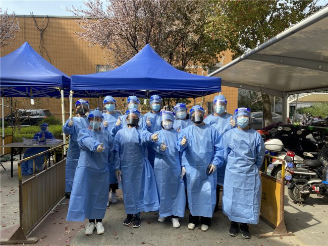 2022年3月面对严峻疫情防控形势我们禁毒社工和禁毒志愿者再次穿上志愿者的衣服,套上“大白”的装备,在核酸检测站、在小区门口,在防控一线共同筑牢防疫的堡垒。