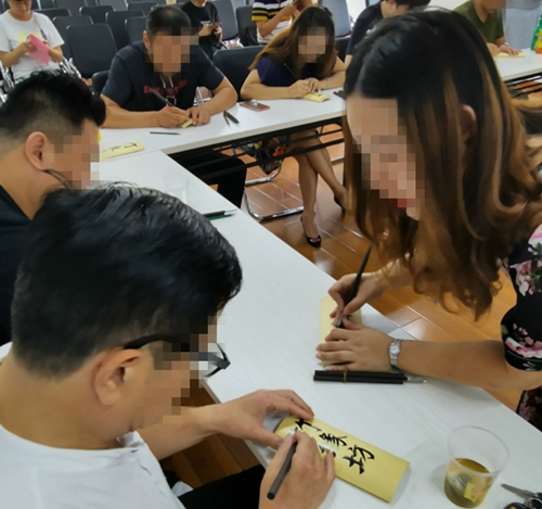 最后的“学习竹刻技艺”环节中,授课老师郁方圆发给每位组员一套刀具,让大家在写有“竹缘坊”三个字的竹片上练习刻字。郁老师向组员们详细讲解了每把刀具的作用和使用方法,教大家怎么按照边线刻字。在组员专心刻字的过程中,郁老师来到每位组员身边,对大家的手法进行细致的指点。在郁老师的指导下,组员将竹片上的“竹缘坊”三个字,沿着描边刻出了轮廓,更有部分组员已经开始“去皮”。通过此次活动,组员对于竹刻有了更多的认识。