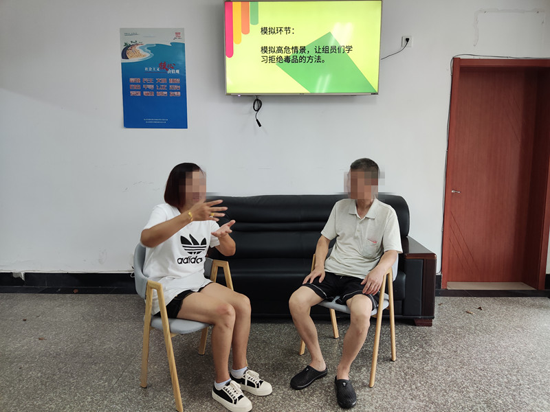 活动开始,主带社工告知组员李大哥因哮喘不幸过世,不能再参加小组活动的消息,组员们都非常痛惜,一起回顾了老李参加活动的点点滴滴,共情于生命的可贵,表示要珍爱生命。活动中,社工介绍本节小组活动的意义和目标,学习防复吸技巧,远离高危情境。能量接力圈的游戏让组员在伤痛的情绪中走出来回归小组氛围。在社工徐老师防复吸课程中,组员们联系实际回想复吸的种种情形,学习应对高危情境的防复吸技巧。随后,组员们分享了自己的戒毒历程和对人生的感悟。大家纷纷表示:相信自己可以戒毒,不会再和吸毒人员接触,会积极乐观的行为,对自己的人生负责。在情景模拟环节,组员现场演绎了高危情境下拒绝毒品的情景,将学习内容学以致用。最后大家交流了参加本节活动的感受:组员们表示防止复吸一定要有脱毒的决心,一定要远离毒品,远离毒友圈,找到一份稳定的工作,让自己的生活充实有活力。