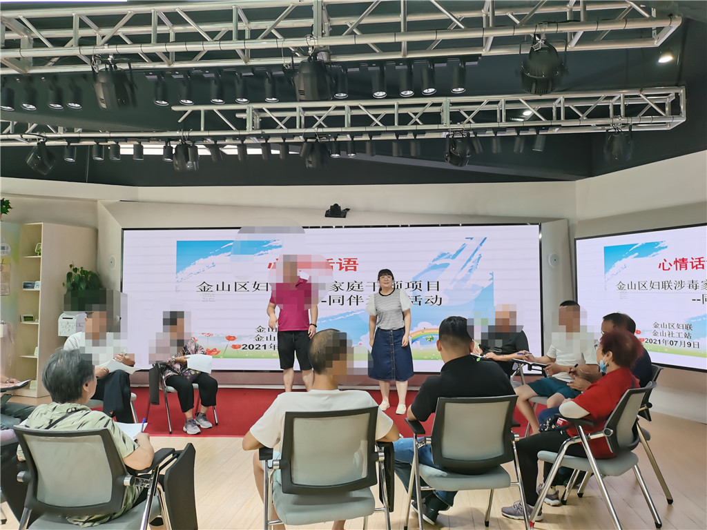 2021年7月9日下午,自强金山工作站在朱泾镇新时代文明实践中心开展“心情话语”–金山区妇联涉毒家庭干预项目同伴示范活动。活动有同伴小姚和社工一起主带。12名社区戒毒康复同伴、7名社工参加活动。