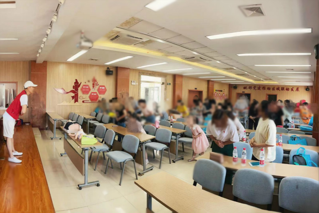 活动现场,区红十字陈振海老师以PPT教学和实践操作相结合的方式进行培训。培训中,陈老师老师分享了临床实例,然后依次讲解中暑及溺水急救、海姆立克急救、心肺复苏急救的方法。互动环节,学员们踊跃答题,积极上台实地演练,感受整个急救过程。通过老师讲解,结合自己的实际演练,学员们快速掌握急救知识和技能。