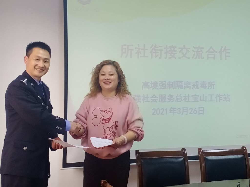 2021年3月26日,所社衔接交流合作推进会在自强宝山工作站会议室举行。与会的有区禁毒办公安专职干部张培明、高境强制隔离戒毒所教育科科长戴建炎、高境强制隔离戒毒所教育矫正中心主任于浩、高境强制隔离戒毒所民警沈煜黄以及自强宝山工作站站长李桢和禁毒社工代表。