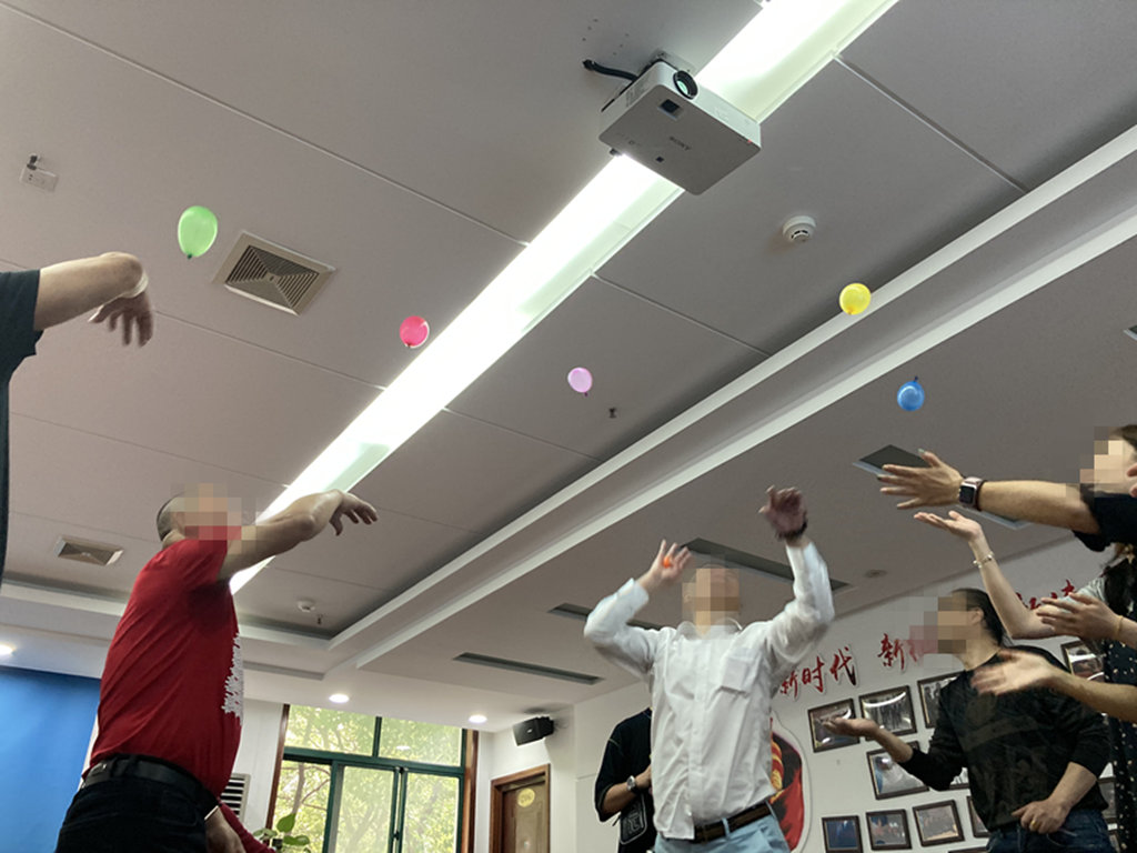 随后的“合力吹气球”游戏,将组员每3人分为一个小组,抽到“嘴”的组员必须借抽到“手”的两个组员的帮助,把气球吹起来,然后两个抽到“脚”的组员抬起抽到“屁股”的组员将气球坐破,通过这个游戏帮助组员互相消除拘谨情绪,活跃气氛,增进彼此间沟通协调和团队能力,让组员在游戏中学会信任和依赖,帮助和合作。