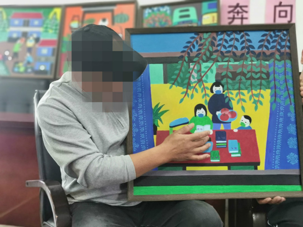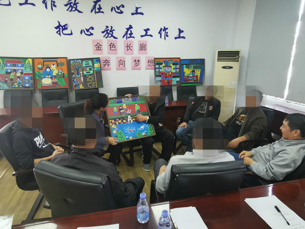主带社工首先向大家介绍了本节活动的主题和内容,主要是分享组员在小组中的收获和处理组员的离别情绪,使每位组员对本节活动有了一定的了解。随后进行了作品展示,将一幅幅裱装色彩鲜艳且带有农村气息的金山农民画《陌生的爱》、《“疫”家人》、《妈妈的味道》……呈现在每位组员面前。金山农民画家朱永金老师应邀对这些作品一一进行了点评,对组员的学习态度表示了认可,并和去年的农民画进行了比较,认为今年的农民画在创作和绘画上都有很大程度的提高。接着主带社工带领各位组员一起回顾了前面五节的小组活动。通过回顾,让组员回忆起自己刚参加小组活动时的情景,组员们也看到了自己的变化和成长,各自分享了参加此次活动的收获。组员小峰说:“他刚开始抱着试一试的心态来到的农民画学习小组活动中,也从刚开始的‘要我学’到现在的‘我要学’,自己也愿意花时间在画农民画上,更加有耐心了。”小军分享到:“在活动中认识到了很多很他同样经历的人,他们的改变给了我前进的动力,让我有勇气去面对自己未来的生活。”小杰则表示:“刚开始参加活动完全是为了社工的面子,到如今自己爱上了金山农民画,家人也非常支持我参加这样的小组活动,我也非常舍不得和其他组员说再见”……组员们纷纷给彼此赠送离别的祝福,希望大家过得越来越好,有机会再聚。