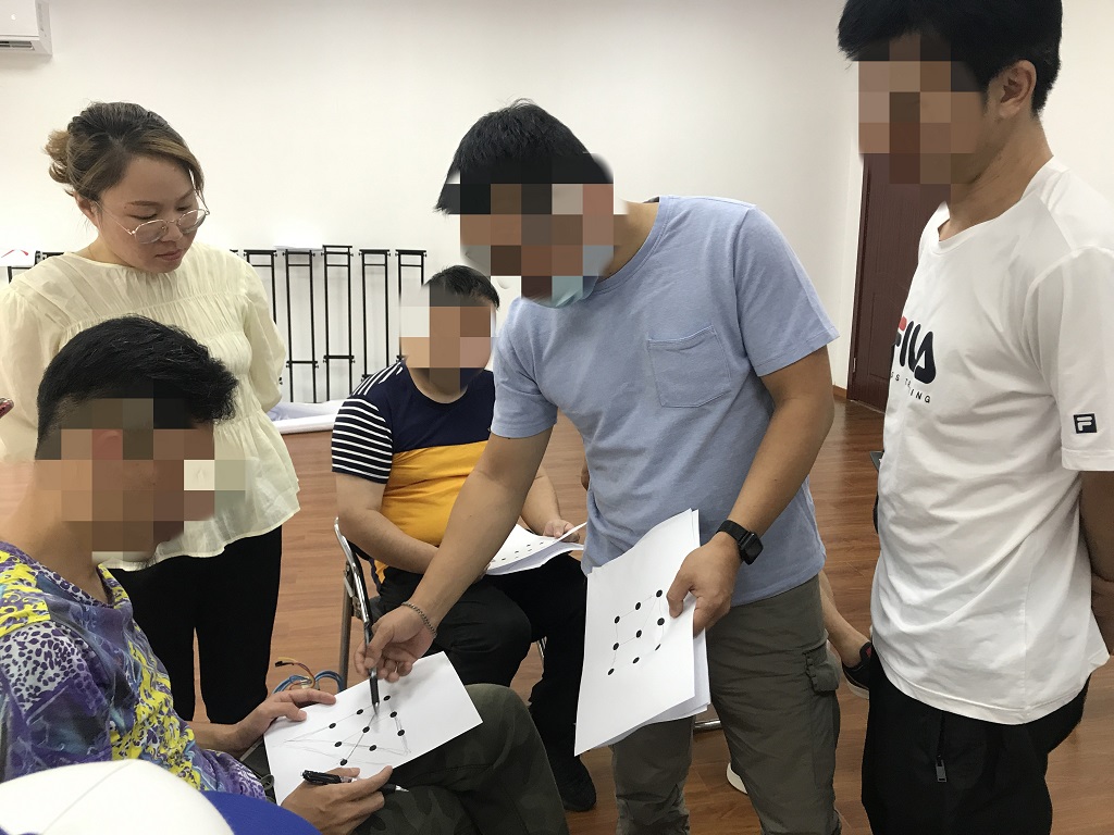 之后,主带社工让组员们扮演理想中的自己。组员们想了一会,组员小曾第一个站起来扮演,其他组员也跃跃欲试。随后,主带社工请每位组员分享在扮演过程中自己的感受。小曾又是第一个,他说:“虽然我曾经有很多不好的经历,但是我决定改过,我想做个好父亲。我希望等将来儿子结婚,能看着他牵起另一半的手,组成新家庭,过着幸福的日子,就能满足了。所以我扮演的是一位看着儿子步入幸福婚姻的老父亲。”组员小杨说:“我儿子和你儿子差不多大,我也有这种想法。自己走过弯路,不希望自己孩子跟着走弯路。为了孩子和家人,就想着自己一定要改正。我现在戒毒康复已经第三年了,我相信我能继续保持好。而且我觉得你做事很认真,认定了一件事就一定能做好,做任何事情认真最重要。”组员小吴说:“我觉得每个人身上都有不同的优缺点,缺点有则改之无则加勉,优点就继续保持,对于别人的优点也可以吸收为已用,让自己变得更好。”所有组员分享过后,主带社工总结表示,通过之前的几节活动,我们发现并总结了每个人的优缺点,这对每位组员来说已经前进了一大步。这次我们通过四线穿九点的游戏激发组员们的发散性思维。又通过角色扮演、分享心得让组员们进一步肯定自己。