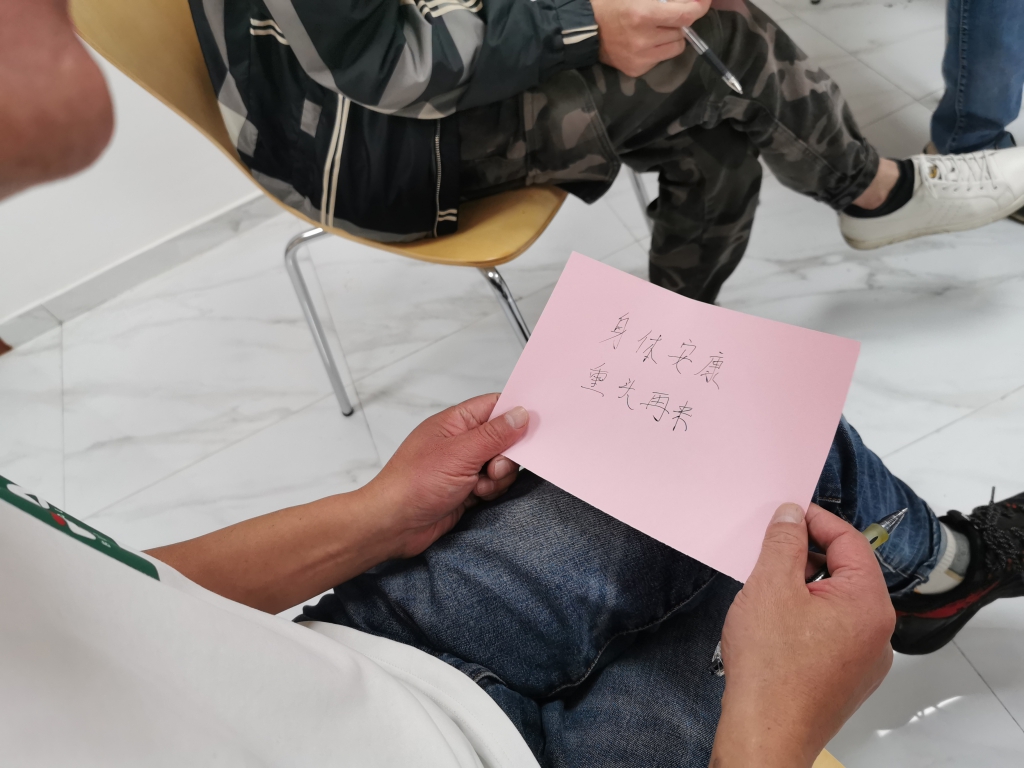 首先,主带社工与组员一起回顾了前五节活动,每节小组活动原定的目标都有实现,每一次的小组活动中都能看到组员们身上的闪光点,如谦让、宽容、有责任心、较强的时间观念等等。随后,社工让每位组员在纸上写下对自己或家人的祝福语,2020年是特殊的一年,有什么寄语或心愿都可以写下来,并读出来与大家分享。组员阿慧对自己的祝福是希望自己可以在今年重新开始,坚定步伐走下去,让家人放心,自己变得更自信;阿勇是希望家人身体安康,自己重新来过;阿良是想忘记过去的一切,不想思考;还有大部分组员也更多的希望家人身体健康等等。