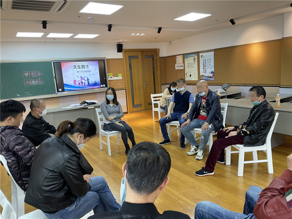 从2020年12月份我们社工在六节小组活动中引导组员们从“自画像”开始认识自我。让他们逐渐认识到形成自己目前的性格和行为往往是内因和外因共同作用产生的。社工从他们入所事件发展轨迹入手,引发他们对于自己负面情绪产生和外部事件(或者人)对自己的影响进行思考,寻找复吸冲动产生的原因。之后,社工又从“心有千千结”活动中带领组员们解开“死结”,从一开始无从下手,直到别人解开了一点之后,组员的想法也会发生实质性的转变。通过游戏使组员们正视戒毒的困难,并从中找到自身的优势,增加希望分值。人们关于他们自身能否成功的信念对于自我调节过程有着巨大的影响。具有高自我效能感的人认为他们有能力获得成功,相反低自我效能感的人怀疑自己的能力,不相信自己能够达到目的。之后社工通过“撕纸”的游戏让组员意识到不同的人对同一事物的不同理解,思维引导行为,心理建设可以引导处事方式,达到相应结果。随后我们还用到了自我效能感中的“言语劝说”。言语劝说在直接经验或代替性经验基础上进行劝说的效果会更好。于是社工设计了多个关于毒品的场景,鼓励每个组员进行角色扮演,让组员分享自己的戒毒经历。