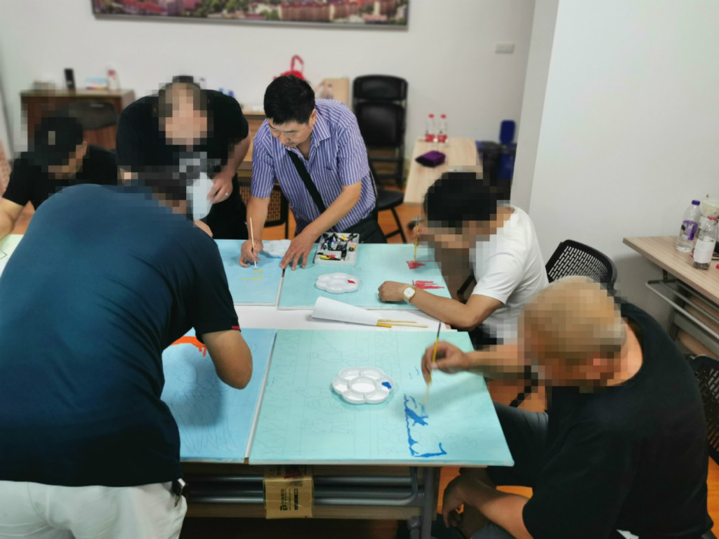 活动开始,主带社工首先介绍了本节活动的主题和目标,使每位组员对今天的小组活动内容有所了解。接着主带社工带领6名组员一起做了一个小墨点的游戏。组员小峰画了一个家,画中一家三口生活其乐融融,他认识到了家的重要性,对家充满了希望,更在尝试着照顾这个家。组员小杰画了他自己在小区门口测量体温的画面,他觉得作为一名志愿者,能坚守在小区的门口,把好小区的大门,很有意义……在接下去的家的故事分享环节,组员小伟分享了他的戒毒之路上家人对他的关心和照顾;小峰分享了他和家人的目前生活状况,生活幸福美满;小军分享了他和他女儿一起坚持学习,在学习中返互相成长,互相帮助……大家都敞开心扉,畅所欲言,活动气氛很好。接下去在朱老师的指导下组员们给农民画作品上色。朱永金老师先给组员演示了如何调颜色,组员都认真听讲。随后自己动手上色,在这个过程中,组员们的执着、认真、耐心都展现得淋漓尽致。最后组员们畅谈了分享了参加这节活动的感受。小军说到:“他连续两年参加这个小组活动了,他感受到了组员的真诚,金山农民画的艺术魅力。”组员小峰分享到:“在活动中,组员们的积极热情,带着他一起向前走,更坚定了他戒毒的信心。”主带社工布置了回家作业并总结了本次小组活动的目标基本达成。最后大家都为自己在本节活动的表现点赞,形成一个同心圆,在欢快的气氛中结束了本节活动。