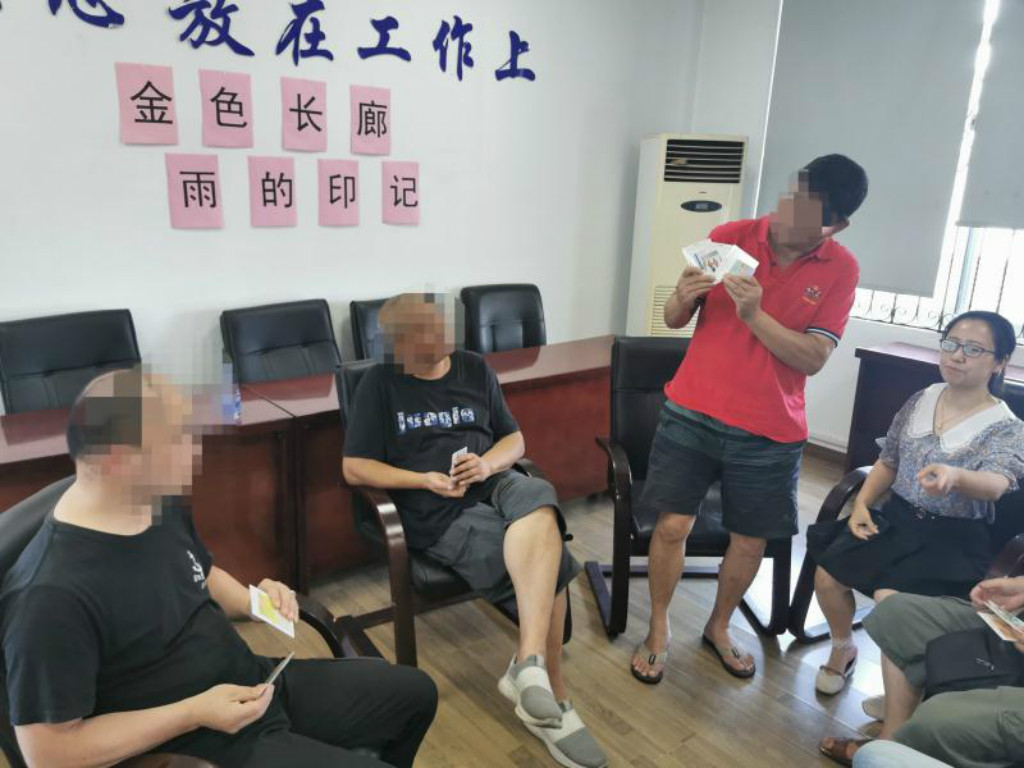 主带社工顾海燕首先回顾上节小组活动内容,并介绍本次活动主题和目标,然后在OH卡“你-我-他”互动中——让每位组员选择3组不同的字卡与图卡组合,用他们的心灵之眼去体会他们的内心世界,察觉他们与家庭成员以及社会大家庭的关联。一名率先发言,他选择的是一大一小两个手牵手的人(图卡)与改变(字卡)组合,代表他自己因为女儿而改变,一个女孩在玩滑滑梯(图卡)与游戏(字卡)组合,他回忆之前带领女儿出去游玩的场景,一个女性与一个男性拥抱(图卡)与付出(字卡)组合,他表示自己在强制隔离戒毒期间妻子为其以及家庭默默付出。之后,其他组员也分享自己的卡片故事。
