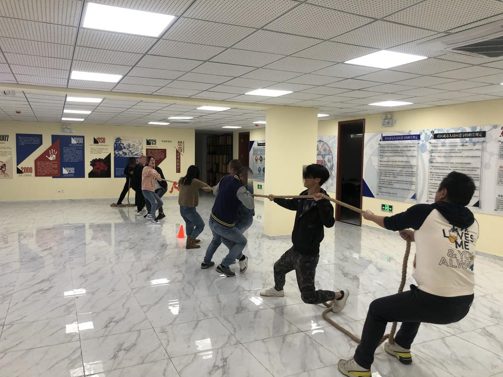 由于大多数组员平时都运动不多,为了保障安全,社工在拔河正式比赛前安排了热身运动,推荐有着徒步带队经验的阿亮带领大家做热身操。在他的带领下,10分钟的热身将大家的身心都调整到最佳状态。组员们每四人一组来到两边,拿起绳子,信心倍增,两名社工也各自站队加入“战斗”,鼓舞士气增强凝聚力。