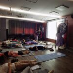 活动伊始,疗愈老师们先引导大家进行简单的唱诵和手臂舞蹈,让大家热身起来,逐渐进入“场域”;接着,跟着老师冥想带领的节奏,大家观察自己的呼吸,通过呼吸解锁全身;当心境渐渐平静下来之后,大家躺下,进入到了声音疗愈环节。