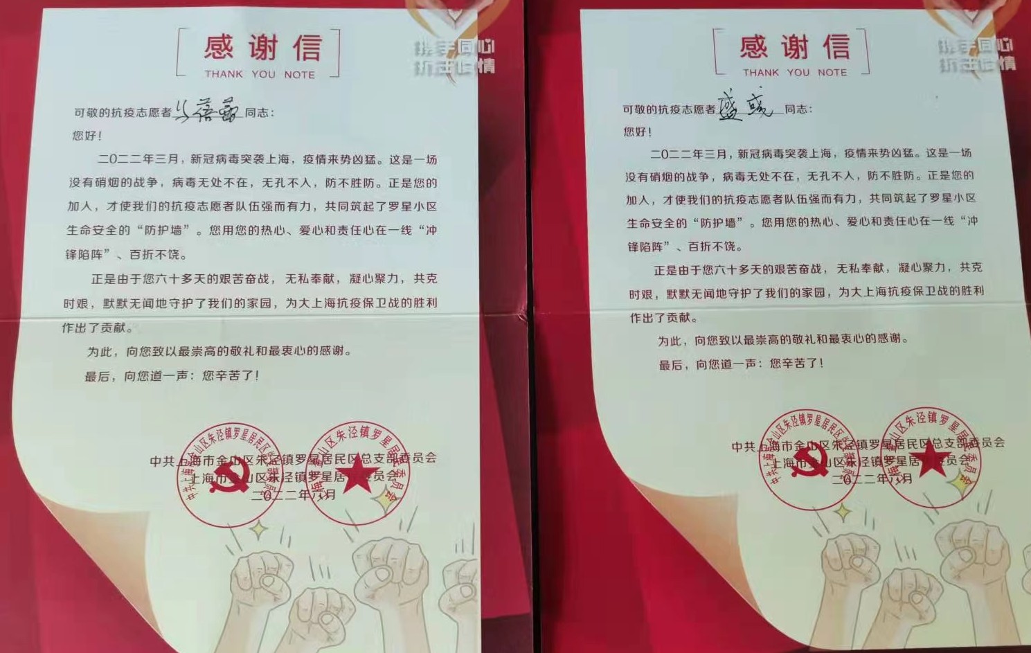 新冠病毒无处不在、无孔不入,这是一场没有硝烟的战争。这次疫情来得突然、来势凶猛,与我们不期而遇。现回忆起来最难忘的是这次疫情防控期间做志愿者及封控驻守在单位的点点滴滴,它是我人生经历中的一次历练。2022年6月20日我和母亲俩人一起收到了朱泾镇罗星居委会发的《抗疫志愿者感谢信》,众志成城,同心战疫,疫情期间,为维护小区居民生命安全,每天登高小区居民楼为居民输送物资、做好核酸检测现场秩序维护、引导老人小孩等特殊人群走绿色通道、负责喵喵机扫码打印和上门做抗原检测、发放防疫礼包、蔬菜等多项志愿服务工作,受到了小区居民的一致好评。