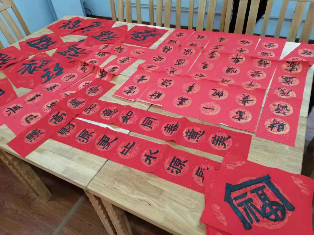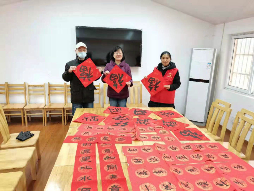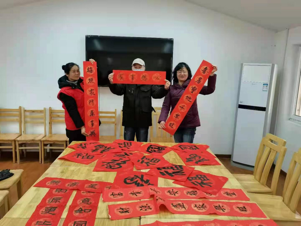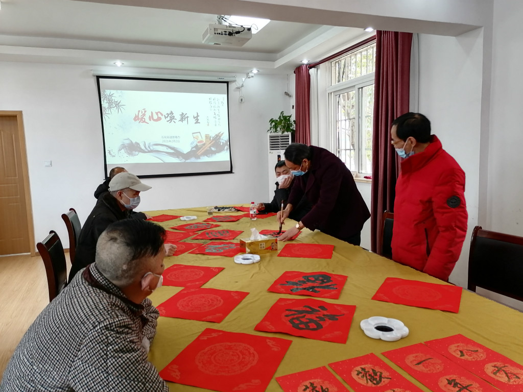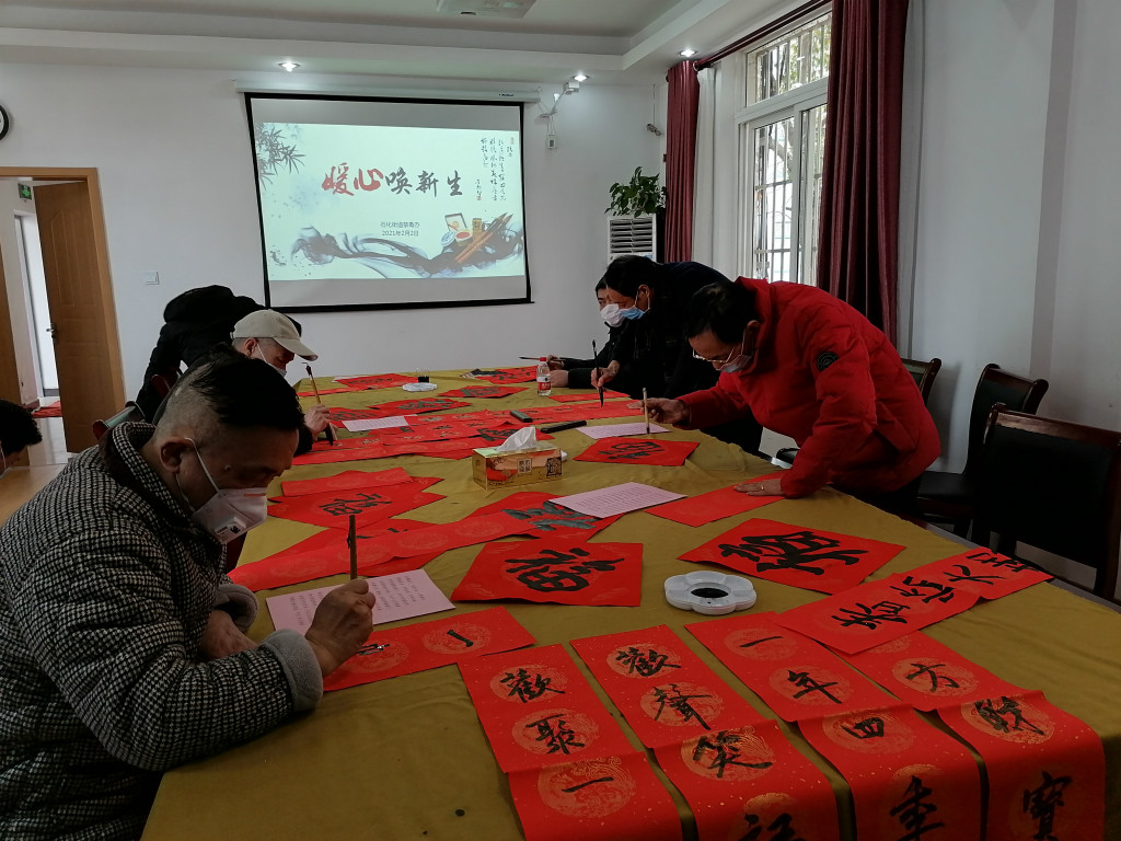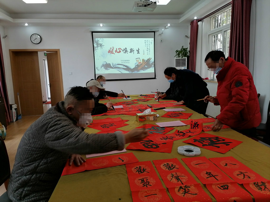 会后,6名戒毒康复书法爱好者在阮永贵老师带领下,开展“暖心阁”迎新特别活动——“暖心换新生”写春联送祝福活动。在悠扬的古琴声乐中,大家提笔挥墨,开始写春联、写“福”字。通过两个小时的挥毫泼墨,一张张方方正正的福字、一幅幅笔精墨妙的春联已铺满活动室,在红红火火的迎新氛围中,我们一起感受着来自戒毒康复人员重生的愿景。