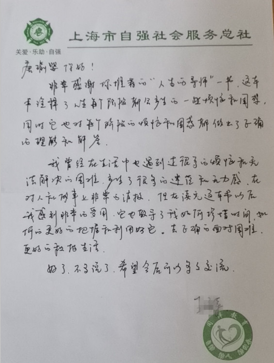 果不其然,一周之后,我收到了来自小王的读后感分享。当时在送书时,我在书中夹了一封信,信中分享了我对书中内容的看法。小王同样用书信的方式向我表达了自己读书后的感受。拿到这一封手写的书信,我深深地感受到小王的尊重和认真。小王在读后感中说道,自己曾经在生活中遇到很多的困难和挫折,产生深深的无力感和迷茫,变得很消极。他在书中找到了新的方向和思路,觉得这本书对他是有用的。并在信的结尾处表示希望今后继续与我分享交流读书心得。