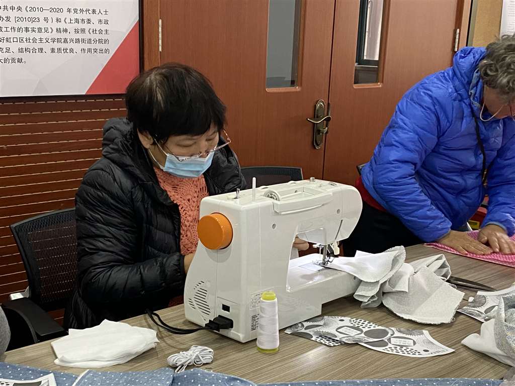 在志愿者老师的指导下,大家先是剪样,再是描线定样,再来剪布定型,随后再用缝纫机将布片拼在一起,最后装上松紧带,一个漂亮的可以反复使用插插片的棉口罩就这么完成了。