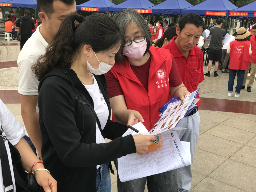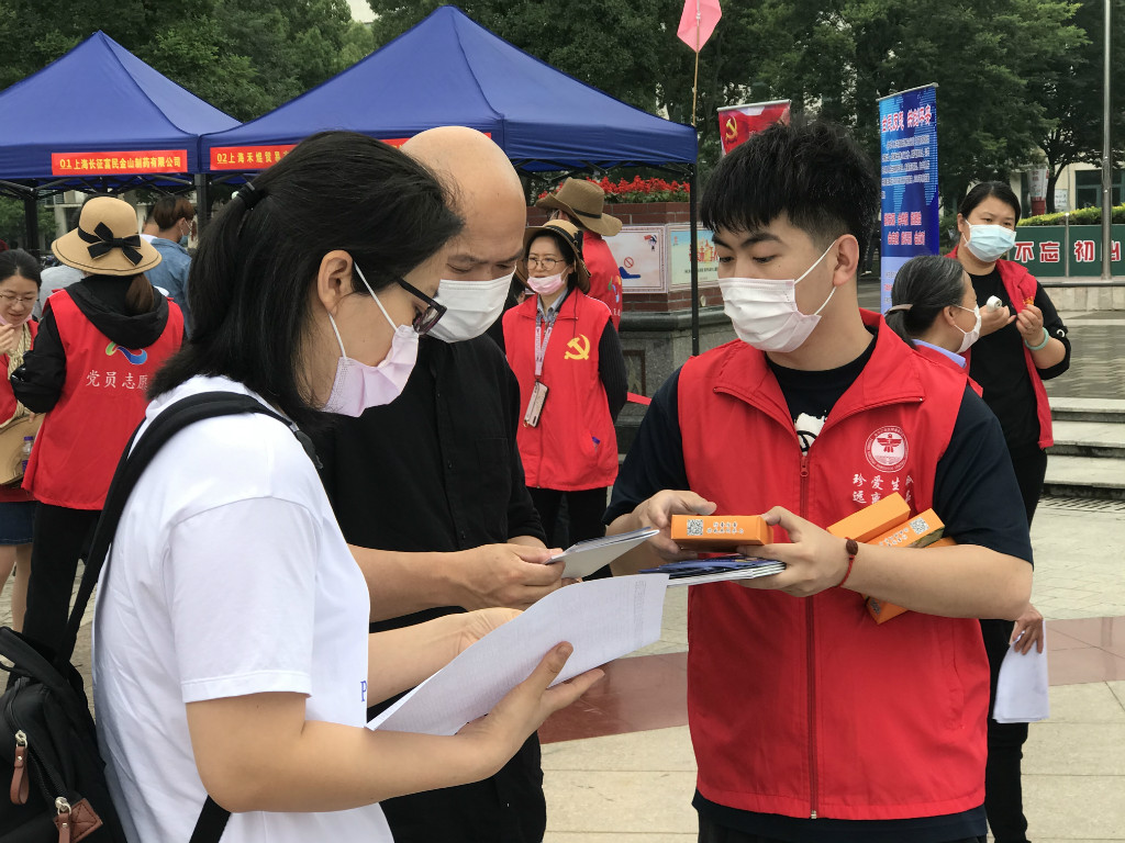 身穿红色马甲的禁毒志愿者、禁毒社工向招聘的企业代表以及来往求职者发放禁毒宣传资料,同时指引大家扫描关注“工业区禁毒”微信,以获取更详尽的禁毒知识。