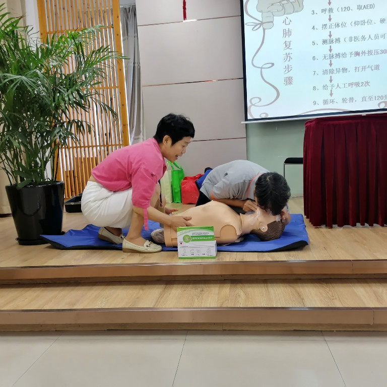 培训中,三位培训老师通过图片、视频、现场示范的形式介绍了急救护理的基本知识,并现场示范AED操作流程、止血包扎过程。介绍在紧急情况下,通过微信小程序上查找附近AED位置,如何使用AED除颤仪进行心肺复苏法实施急救;介绍在紧急情况下,如何运用绷带、身边的可取之物进行包扎止血。示范结束后,志愿者们逐一上台进行实际操作,培训老师对志愿者操作不规范的动作手把手地进行指导和纠正,以确保动作规范。