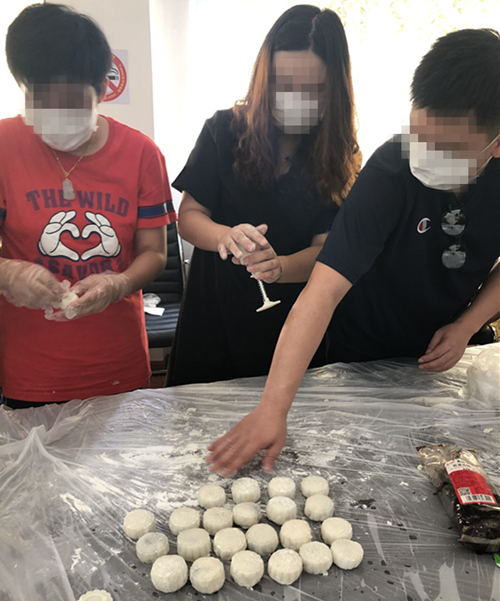 活动由同伴辅导员老朱主带,活动开始前老朱讲述了此次活动的主题、目标和流程,同时告诉同伴们中秋节吃月饼这一传统习俗的由来,大家都听得津津入味。随后在老朱的带领下,大家纷纷挽起了袖子,准备一展身手。老朱先向大家介绍了制作冰皮月饼所需要的工具和材料,并且简单讲解了制作冰皮月饼的步骤,然后开始教大家如何制作冰皮月饼。先将冰皮粉倒在桌上,当中留有一点空间,然后按照冰皮粉和水的比例倒入85度的水,将水和冰皮粉搅拌均匀,揉搓5分钟左右,直到表面光滑细腻。然后用保鲜膜包裹后静止5-10分钟;馅料分成25克搓圆备用。最后,拿取25克冰皮,揉搓均匀,压扁包入馅料,放进冰皮月饼模具,按压、脱模,一个冰皮月饼就成功了。老朱一边教一边向大家传授制作冰皮月饼的注意事项。同伴们各个都跃跃欲试,争先恐后地加入到活动中。当大家看到一个个成型的月饼铺满台面时,脸上都露出了无比自豪的笑容。