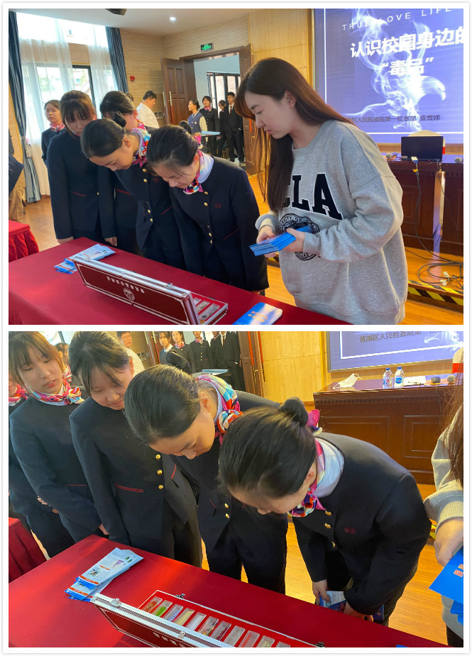 活动中,社工通过发放禁毒宣传品和展示展板的形式,向现场学生们讲解毒品的基本知识以及危害后果。当前,毒品种类越发多样化,对社会的危害也变得越来越严重,社工使用仿真毒品模具让青少年朋友更直观地认识各类传统以及合成类毒品的种类和形状,提醒大家在日常生活中一定要提高防范意思。随后,检察官以案例的形式向2个班级50多名学生宣传毒品的种类、危害、管制以及犯罪惩罚措施等方面的内容,并结合实际讲解禁毒法律法规,热情解答学生们提出的关于毒品方面的问题。社工告诫学生们在社会交往中要提高警惕,珍爱生命,切勿沾染毒品。