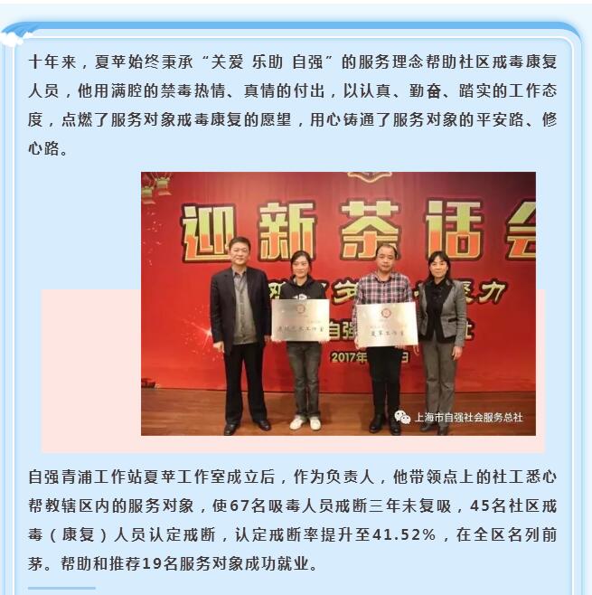 夏苹,44岁,大学本科社会学毕业,中共党员。注册社工师,心理咨询师。2009年1月入职自强,在青浦区夏阳街道社工点从事一线禁毒帮教服务,是社工点的点长,也是自强青浦工作站夏苹工作室的负责人。
