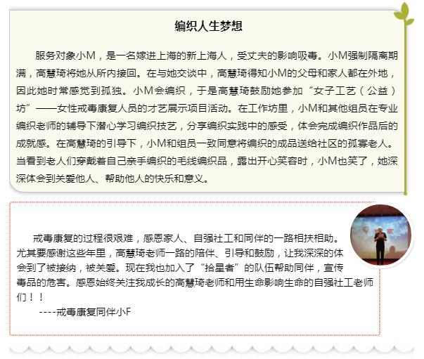 高慧琦在杨浦工作站江浦社工点负责2个社区88名登记在册吸戒毒人员的一线专业服务工作,她以身作则,高质量地完成各项工作任务:服务对象建档率100%;接所率100%;社区戒毒(康复)20人,执行率100%;开案率100%;分类、干预评估率100%。每一个百分之百后面,都凝聚了高慧琦的默默付出。由于还同时担任副站长、点长和专业督导,开会、培训、沟通协调几乎占用了她大多数工作时间,很多的个案访谈记录和台帐她都是利用休息时间完成。在高慧琦的悉心帮教下很多名服务对象戒断毒瘾,顺利康复,有的参加社区禁毒演讲,献身说法;有的成为了项目活动的积极分子,小M就是其中的一位。