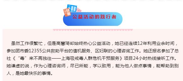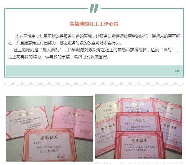 高慧琦作为杨浦工作站副站长和专业督导,她协助站长完善、健全各项规章制度,抓好队伍建设和一线业务工作。完成工作站每年度各阶段工作目标的制定、工作计划的筹划、实施和总结。加强专业督导,促进绩效评估,提升同工的专业工作能力。她与内勤、通讯员、志愿者联络员一起及时反馈一线工作信息,根据实际工作需要,完善区内各类统计报表、台帐,规范操作,提高统计的准确性和效率,按要求及时上报总社和区禁毒办。