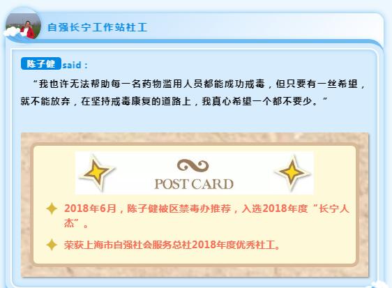 服务对象老王曾多次因吸毒、贩毒被判入狱和强制隔离戒毒。老王没有工作,无收入来源,经济压力比较大,对社会有很多报怨,也不愿接纳社工。陈子健没有放弃,他积极向区禁毒办和北新泾街道相关部门沟通和反映老五的情况,最终获得支持。老王于2016年底进入区某安帮服务社工作,成为一名摩拜单车整理员。老王看到了陈子健为他找工作所付出的努力,深受感动,他向陈子健打开心扉,吐露心中曾经的苦闷。陈子健引导老王对过往吸毒经历进行反思,强化吸毒造成的危害的认知,老王逐渐完成了从“要我戒毒”到“我能戒毒”的戒毒理念转变。