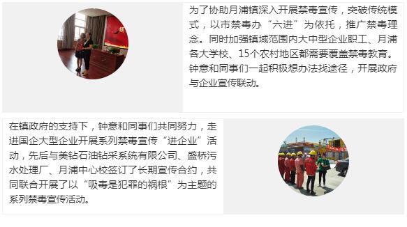 多年来,无论工作再忙,任务再多,再繁重,她都坚持走访服务对象家庭,为困难服务对象及家庭扶危解困的同时,耐心细致地运用社工专业知识开展帮教工作。靠着实干的精神、专业的访谈技巧,钟意用关心、爱心和耐心搭建起服务对象与社会的沟通联系,帮助许多服务对象戒断毒瘾走向新生。