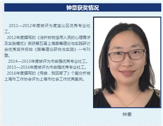 钟意, 2010年11月入职自强,中共党员,是自强宝山工作站月浦社工点一线社工,也是月浦社工点禁毒条线负责人。多年来,她真诚、实干、勤奋、进取的工作作风赢得了各级领导和广大社工们的赞誉,数次被评为市优秀社工。