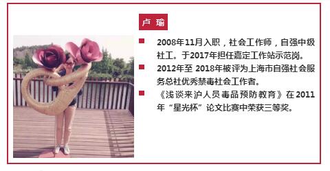 面对各种不同性格、不同类型的对象应该采取何种谈话方式,卢瑜认为这都是一门大学问。如一名服务对象出所以后遭到家人与周围邻居的不理解,只有找到社工倾诉内心的困惑,卢瑜不管对象情绪有多激动,都能接纳他们,做一个聆听者,鼓励他们畅开心扉,帮助他们共渡难关。卢瑜深知家庭支持对于服务对象戒毒的重要性,她一次次上门家访,从一开始吃闭门羹到最后的接纳,其中的辛苦自知。为了协助服务对象就业,她一次次在各部门间奔波,只要有一线希望也要尽力争取。卢瑜常说,看到一名名对象能增强戒断的自信心,巩固戒断成果,就是再苦再累也值得!从2009年的“书画人生”、“快意人生”小组活动到2018年的“涅槃重生”项目专题、小组活动,卢瑜抓紧每一次活动的契机与服务对象沟通,通过优势视角充分挖掘对象潜力。在她的鼓励与引导下,参加同伴教育活动的多名同伴得到了成长与积极的改变,同伴们从当初的内向胆怯到如今的自信满满,走的每一步都离不开平时专业关系打下的坚实基础。令人欣喜的是,两名同伴已经成为嘉定区同伴辅导员队伍中的骨干,在活动中表现出色,也帮助了更多的同伴走出“毒潭”,恢复正常的社会功能。