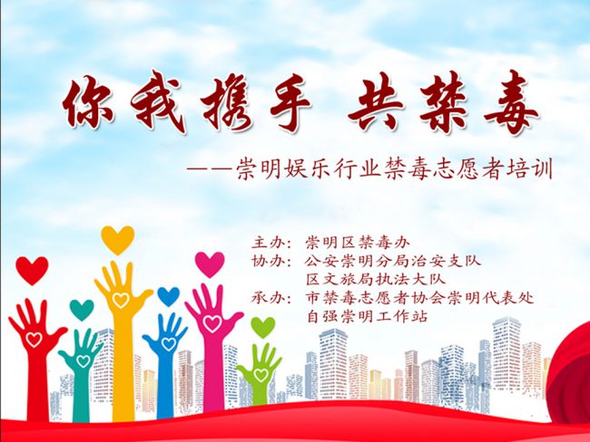 为不断强化娱乐行业禁毒志愿者的志愿服务能力,更好的参与禁毒工作。2020年7月10日,自强崇明工作站在区禁毒办的支持下组织各乡镇的娱乐行业禁毒志愿者在崇明社区帮教服务中心会议室开展了 “你我携手 共禁毒”为主题的志愿者专题培训。特邀请了崇明区禁毒协调室主任吴亦东、文化执法大队副大队长闻陆平、公安崇明分局吴丹萍警官参与此次培训。