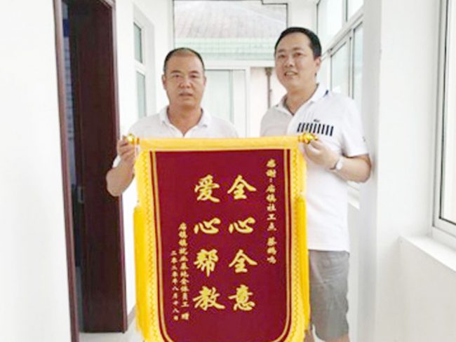近日,崇明区庙镇就业基地负责人陆锦宝来到自强崇明工作站庙镇社工点,给禁毒社工蔡鹤鸣送上了一面锦旗,上面写着“全心全意 爱心帮教”,下面落款是“庙镇镇就业基地全体员工”。