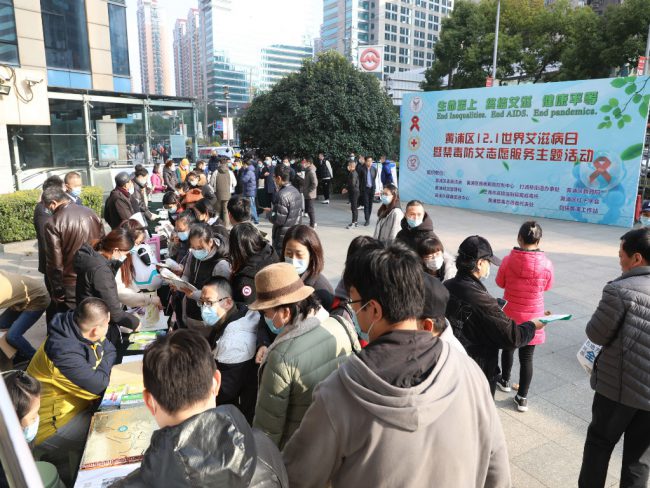 在第34个“世界艾滋病日”来临之际,11月30日,由黄浦区委政法委、区疾病预防控制中心、打浦桥街道办事处、区教育局、黄浦邮政管理局、市高境强制隔离戒毒所、区红十字会、区健康促进中心、区禁毒志愿者协会和自强黄浦工作站等单位联合主办的“生命至上,终结艾滋,健康平等”—黄浦区12.1世界艾滋病日暨禁毒防艾志愿服务主题活动在打浦桥日月光广场举行。