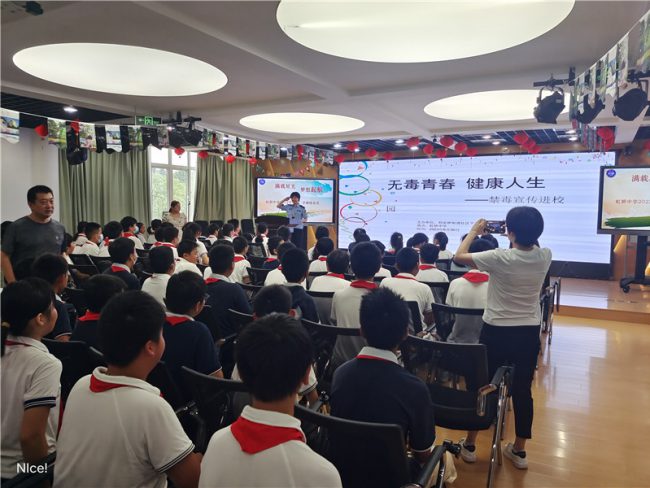 为深入推进青少年毒品预防教育,增强青少年禁毒意识,2023年6月30日上午,长宁区程家桥街道联合上海市未成年犯管教所与禁毒工作小组成员一起前往虹桥中学,开展了“无毒青春 健康人生”的宣传活动。