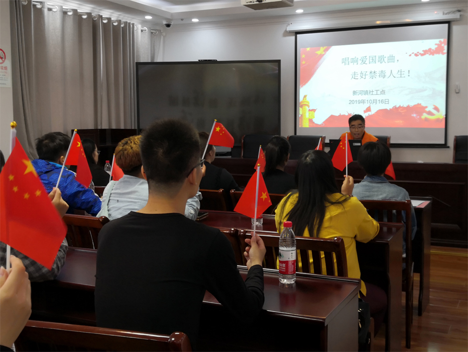 为弘扬新时代社会主义核心价值观,加强辖区内青少年的爱国主义教育和禁毒意识,在金秋十月,中华人民共和国成立70周年之际,10月16日下午,自强崇明工作站新河镇禁毒社工邀请辖区内十多名青少年,在社工点开展爱国教育和禁毒教育知识讲座。