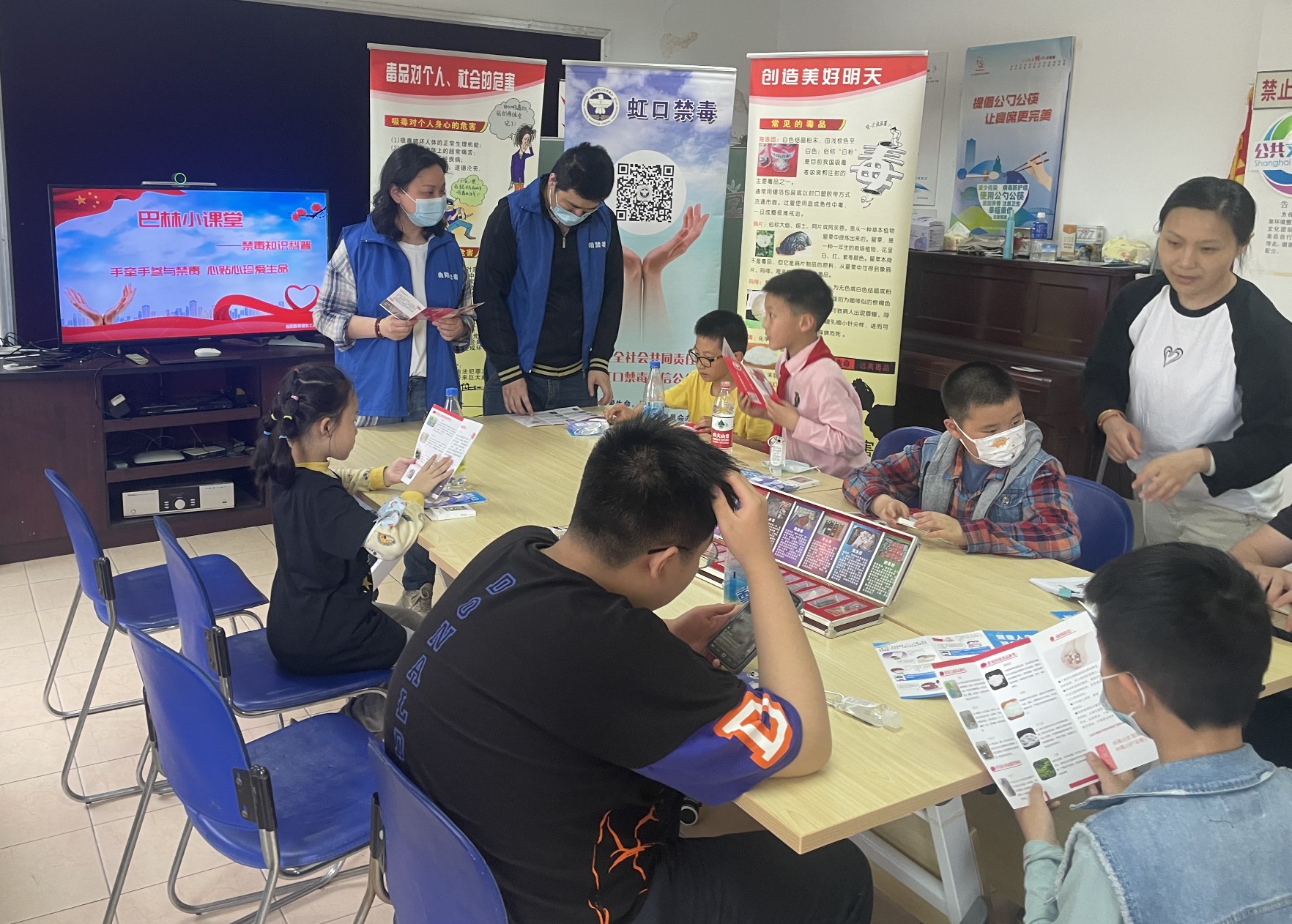 5月5日,自强虹口曲阳路街道的禁毒社工会同禁毒志愿者们在街道平安办的组织协调下,来到了巴林居委会,为下课后的学生们进行了一场主题为“手牵手参与禁毒、心贴心珍爱生命”的禁毒宣传活动。